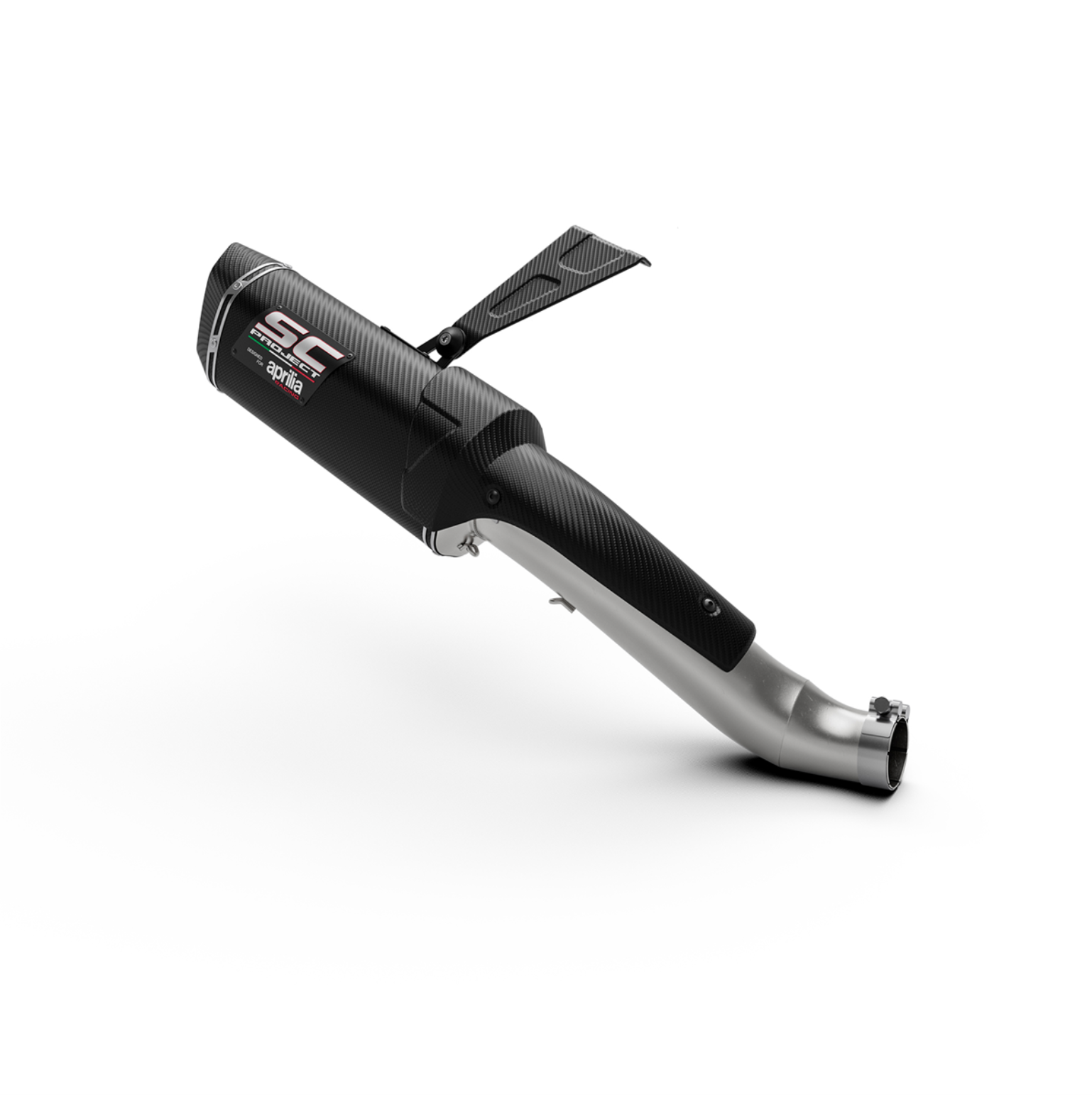 La combinaison de l'expertise d'Aprilia et de SC-Project dans le domaine de la course automobile a donné naissance à un silencieux à glissement pour la RSV4 et la Tuono V4, fabriqué en titane et recouvert de fibre de carbone pour une esthétique plus sportive. Il est équipé d'un support en fibre de carbone qui permet de le fixer à la moto même en configuration monoplace. L'utilisation du titane et de la fibre de carbone permet d'obtenir une réduction de poids de -2,3 kg par rapport au silencieux standard, améliorant ainsi le rapport puissance/poids de la moto. Il offre également un son incomparable inspiré de la course automobile.